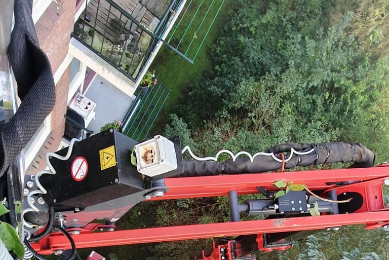 In het geval van bosschages werken wij vaak met een spinhoogwerker, omdat deze wendbaar is, weinig ruimte in beslag neemt voor het stempelen en makkelijk is te verplaatsen. Deze hoogwerker kan een werkhoogte van maximaal 21 meter bereiken. Een interessante nevendienst die wij hiermee nog kunnen combineren is bijvoorbeeld gevelreiniging.
